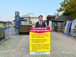 박동식 사천시장은 23일 오전 8시 국회 앞에서 ‘우주항공청 특별법의 조속한 국회 통과를 촉구’하는 1인시위를 벌였다.