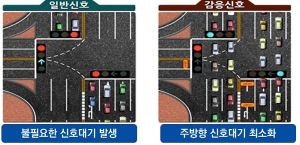 감응 신호 시스템은 좌회전 차로에 감지 센서를 설치해 좌회전 대기 차량이 있을 경우 좌회전 신호가 작동하는 시스템이다.