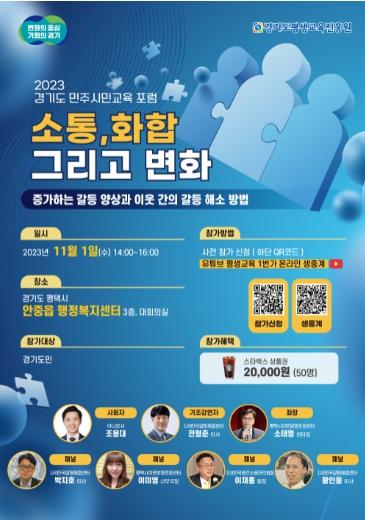 경기도평생교육진흥원은 11월 1일 평택시 안중읍행정복지센터 3층 대회의실에서 ‘2023년 경기도 민주시민교육 인식개선 포럼’을 개최한다.