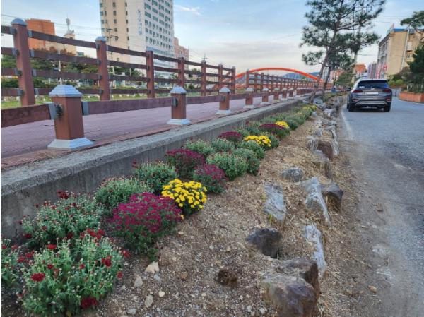이번 사업을 통해 도고천변 산책로, 포토존, 유리병원 맞은편 화단 등 총 3개소에 국화꽃 2,000본을 심었다고 밝혔다.