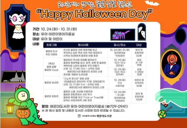 부산광역시립해운대도서관은 10월 24일부터 31일까지 유아와 어린이를 대상으로 핼러윈 맞이 어린이 문화 체험행사 ‘Happy Halloween Day’를 운영한다.