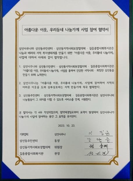 성북구 삼선동 지역사회보장협의체, 삼선동 주민센터, 길음종합사회복지관, 마을가게(삼선 사우나, 삼영탕)와 ‘아름다운 이웃, 우리동네 나눔 가게 사업’ 4자 협약을 체결했다.