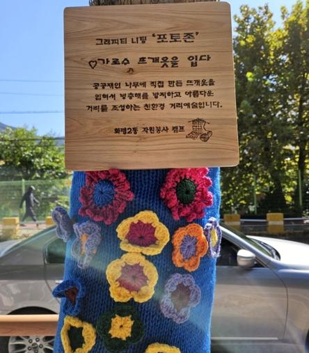 화명2동 자원봉사캠프 송미숙 캠프장은“봉사자들과 함께 만든 뜨개옷으로 병충해도 방지하고 아름다운 거리를 조성하여 주민들에게 색다른 볼거리를 제공할 수 있어서 매우 기쁘고 보람차다.”라고 밝혔다.