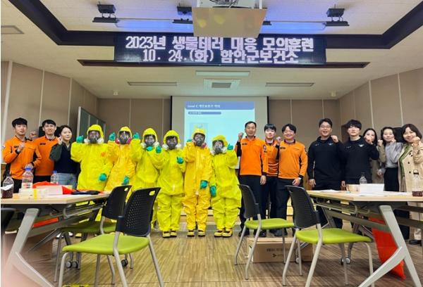 함안군은 지난 24일 함안군보건소 보건교육장에서 경남감염병관리지원단, 함안소방서, 함안경찰서 등 유관기관 관계자 20여 명이 참석한 가운데 생물테러 대응 소규모 모의훈련을 실시했다.