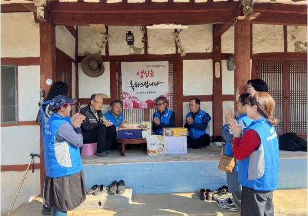 고창군 성송면 지역사회보장협의체는 23일 독거 어르신댁을 찾아 ‘생신상 차려드리기 사업’을 추진했다. 성송면 지사협에선 떡케이크와 음식, 생신선물을 전달하며, 축하와 온정을 나누는 시간을 보냈다.