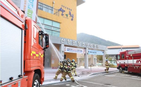 지난 24일 산청군청소년수련관에서 민·관·군·경 등이 함께 실시한 훈련은 대규모 지진으로 인한 건물의 붕괴에 따른 화재 발생 상황 등을 가정해 진행됐다.