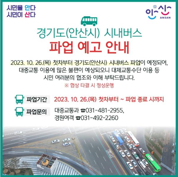 경기지역자동차노동조합 등 시내버스 노동조합이 임금협상 결렬 등을 이유로 오는 26일 첫 차부터 시내버스 총파업에 돌입할 것을 예고한 가운데, 안산시는 비상 수송 대책 본부를 구성해 24시간 비상근무 체계로 전환하는 한편, 대체 노선이 부족한 곳에 전세버스를 투입한다.