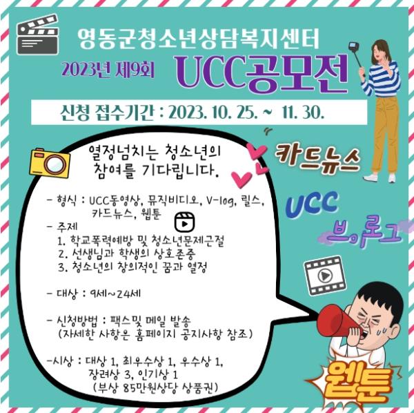 충북 영동군 영동군청소년상담복지센터는 ‘2023년 제9회 청소년문제예방 UCC 공모전’을 개최한다고 26일 밝혔다.