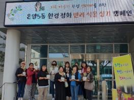 이에 송경숙 온양5동장은 “최근 환경에 관한 이슈가 과거에 비해 더 많은 조명을 받고 있다. 그만큼 환경 위기가 이제는 직접적으로 생활 속에서 체감할 수 있는 수준으로 심각해졌기 때문일 것이다. 행정복지센터는 주민과 가장 일선에서 만나는 곳으로써 앞으로도 지속 가능한 성장을 위한 여러 캠페인과 교육을 통해 더 나은 미래의 밑거름을 다질 수 있도록 최선을 다하겠다”고 전했다.