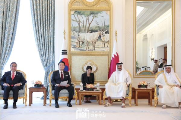 회담에 앞서 아미리 디완 궁 중앙홀에서 윤석열 대통령의 국빈 방문을 축하하는 공식 환영식이 성대하게 개최됐다. 카타르 측은 대통령이 탑승한 차량이 아미리 디완 궁 입구로 들어서자 기마부대와 낙타부대가 호위하며 차량을 안내했다. 대통령은 아미리 디완 궁 중앙홀에 입장해 영접 나온 타밈 국왕과 함께 의장대의 사열을 받은 후 정상회담장으로 입장하여 카타르 측 수행원들과 인사를 나눴다.
