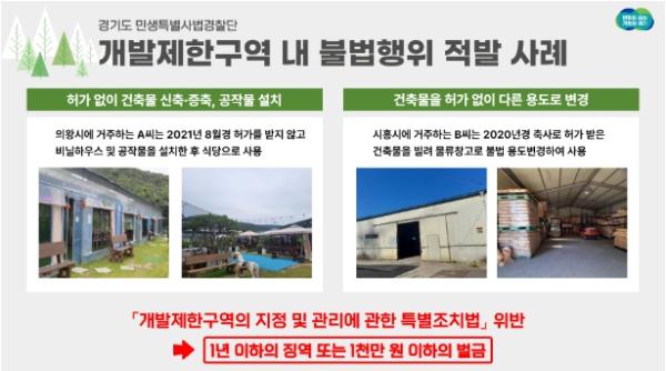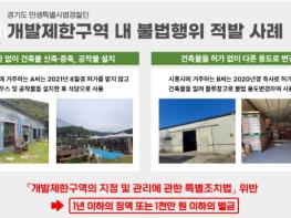 경기도 민생특별사법경찰단은 지난 9월 18일부터 10월 6일까지 개발제한구역 내 불법행위가 의심되는 224곳을 단속해 무허가 건축, 불법 용도변경, 형질변경, 물건 적치 등 36건을 적발했다고 26일 밝혔다.