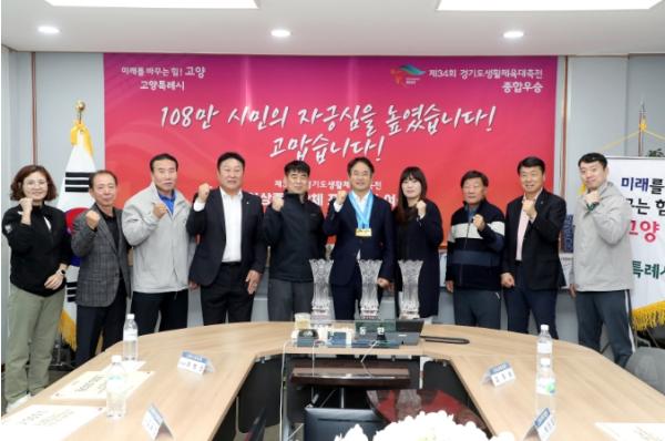 이동환 고양특례시장이 지난 25일 고양시청 열린시장실에서 ‘제34회 경기도 생활체육대축전’에 입상한 종목 단체에 포상금을 전달했다.