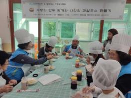 한전MCS 직원 27명은 15시 혜명양로원에서 어르신 14명, 아동 14명과 모둠별로 만두를 빚고, 직접 다듬은 과일로 나만의 주스를 만들어 먹었다.