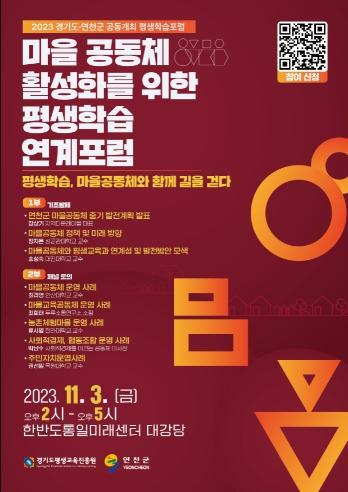 경기도평생교육진흥원과 연천군이 함께 ‘마을 공동체 활성화를 위한 평생학습 연계 포럼’을 11월 3일 한반도통일미래센터에서 개최한다.