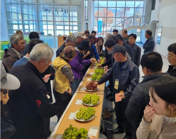 이날 평가회는 농업기술센터 및 안동샤인머스캣 작목반(50명)이 참석한 가운데 샤인머스캣 적기 수확 교육, 농가별 사례발표, 식미 평가 순으로 진행됐다.