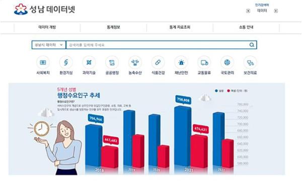 해당 사이트는 성남시가 생성·보유한 행정데이터와 통계 정보를 한 곳에서 확인할 수 있는 통합데이터 시민 개방 창구다.