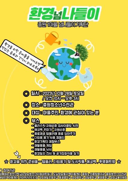 10월 28일 중원청소년수련관에서 진행되는 이번 행사에서는 넘나들이 동아리의 해단식과 공동캠페인인 ‘환경 넘 나들이’를 같이 진행한다.