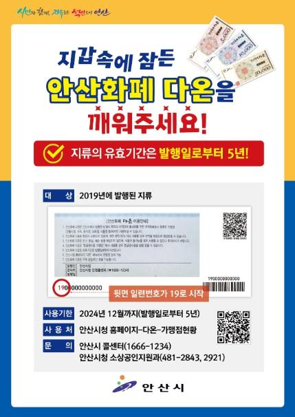 안산시가 지난 2019년 4월 최초로 발행한 안산화폐 다온 지류 상품권의 사용기한이 내년도 12월까지(발행일로부터 5년)로 기한이 임박한 가운데, 기한 내 사용해 줄 것을 당부하고 나섰다.