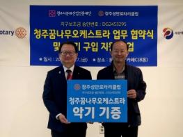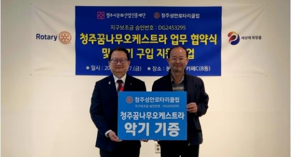 청주시문화산업진흥재단은 지난 27일 11시 동부창고에서 3740지구 청주성안로타리클럽과 청주꿈나무오케스트라의 안정적인 운영과 활성화를 위한 업무협약을 체결했다고 밝혔다.