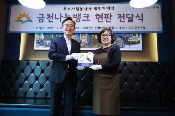 금천구는 우수자원봉사자 할인가맹점인 ‘금천나눔뱅크’로 등록된 더치앤빈 은행나무시장점(대표 박원희)과 (주)아울렛마트(대표 김창남)에 현판을 전달했다고 밝혔다.