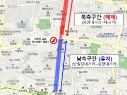 또한, 존치하는 중앙로 남편도로(반월당~중앙네거리, L=0.6km) 구간과 대중교통전용지구 해제 구간인 중앙로 북편도로(대구역네거리~중앙네거리, L=0.45km)에 대해서는 경찰, 중구청, 도로교통공단 등 관계기관과 협업해 변화하는 교통 여건에 대해 지속적인 모니터링과 보완 대책을 마련해 시민 교통 불편을 최대한 줄이도록 노력할 계획이다.