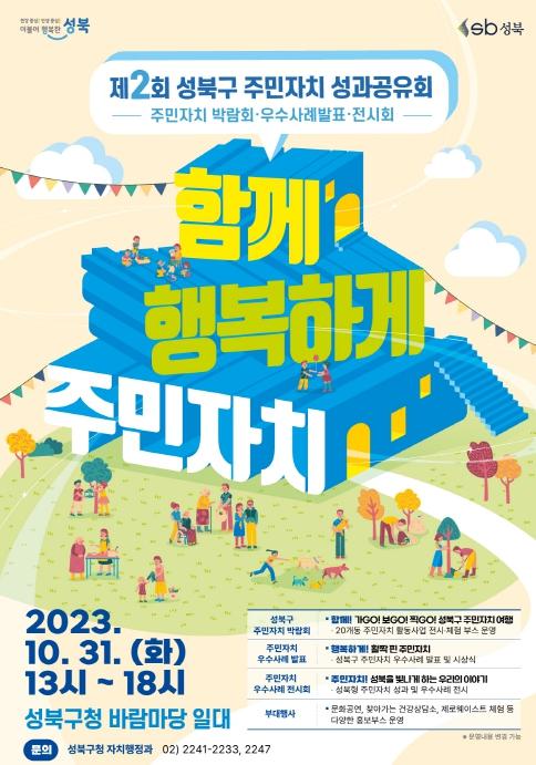 서울 성북구가 31일 구청 바람마당에서 ‘제2회 성북구 주민자치 성과공유회’를 개최한다. ‘함께! 행복하게! 성북의 주민자치!’라는 슬로건 아래 마을의 변화를 이끌어 온 각 동의 주민자치회 활동을 공유한다. 서로의 우수사례를 벤치마킹하며 함께 성장할 수 있는 주민 소통과 화합의 축제를 만들 예정이다.