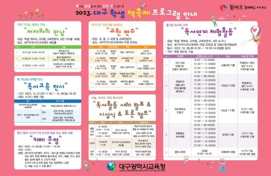 대구시교육청은 즐거운 독서문화를 확산하고, 학교와 지역사회 독서인문교육 소통의 장을 마련하기 위해 10월 27일부터 28일까지 양일간 대구민주시민교육센터, 대구2ㆍ28기념학생도서관에서 ‘2023. 대구 학생 책축제’를 개최한다.