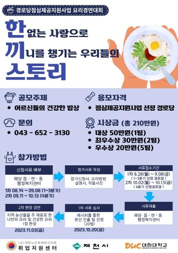 제천시는 민선 8기 공약사업으로 추진중인 ‘경로당 점심 제공 지원 사업’ 선정 경로당을 대상으로 대한노인회 제천시지회(지회장 최동수) 주관 ‘경로당 한끼스토리’ 요리 경연대회를 개최한다.
