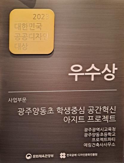 29일 시교육청에 따르면 ‘광주양동초 아지트 공간 조성 사업’은 올해 3월 준공돼 문화체육관광부와 한국공예디자인문화진흥원이 주관하는 ‘2023 대한민국 공공디자인대상’ 공모에 출품해 ‘사업부분’ 출품 11개 작품 중 우수상을 받았다. 시상식에는 광주양동초 교장, 교육청 시설과 관계자, 기획과 설계를 담당한 건축사가 참여했다.