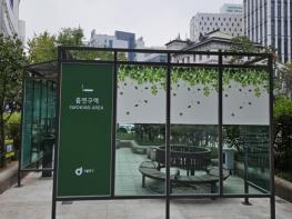 서울 중구가 지난 25일 한국은행 앞 광장쉼터 일대에 새로운 디자인의 ‘개방형 흡연 부스’를 시범 설치했다.