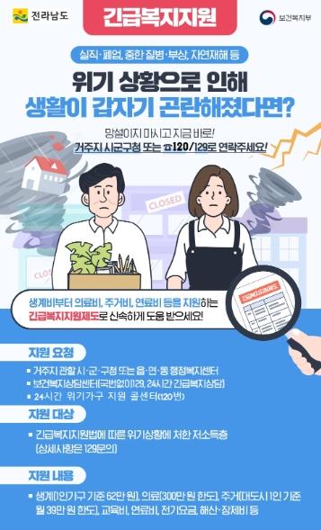 긴급지원을 바라는 도민은 주민등록 주소지 시군 및 읍면동 행복복지센터, 보건복지상담센터(129번), 전남도가 운영 중인 24시간 위기가구지원 콜센터(120번)를 통해 상담 받을 수 있다.