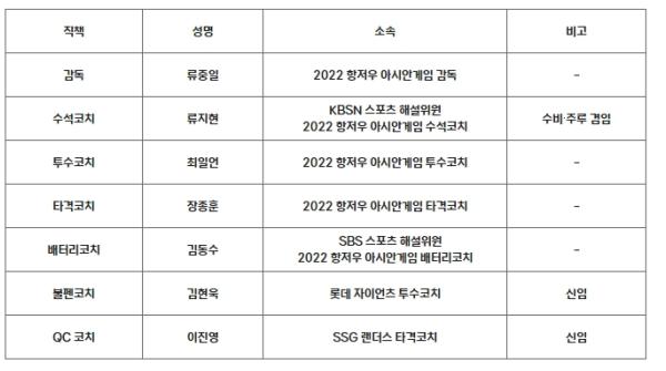 신규 코치로는 불펜 코치를 담당할 김현욱 롯데 투수코치와 QC 코치를 맡게 될 이진영 SSG 타격코치 등 2명이다.