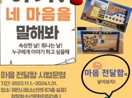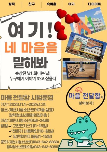 제천시는 11월 1일부터 제천시청소년센터, 장락청소년문화의집에서 청소년 ‘마음 전달함’을 시범 운영을 한다. 마음 전달함은 올해 제6회 제천시 청소년 정책 제안콘서트에서 제안된 것을 채택하여 3개월 간 시범 운영을 거쳐 2024년 정책에 반영될 예정이다.