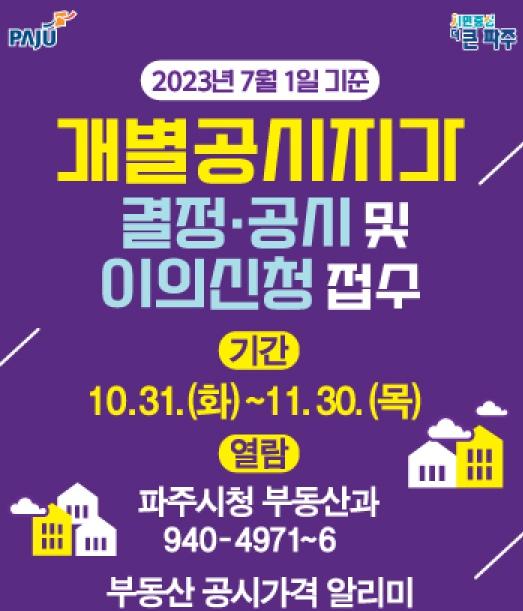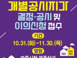 파주시는 2023년 7월 1일 기준 개별공시지가에 대해 10월 31일자로 결정·공시하고, 11월 30일까지 토지소유자와 이해 관계인 등의 이의신청을 받는다.