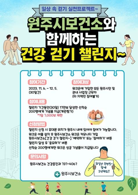 원주시보건소는 시민의 ‘일상생활 속 걷기 습관 생활화’ 동기부여를 위해 원주시보건소와 함께하는'건강 걷기 챌린지'를 운영한다.