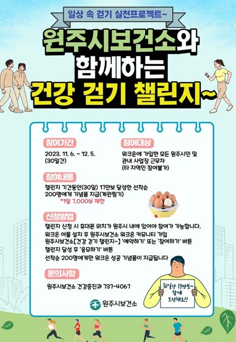 원주시보건소는 시민의 ‘일상생활 속 걷기 습관 생활화’ 동기부여를 위해 원주시보건소와 함께하는'건강 걷기 챌린지'를 운영한다.