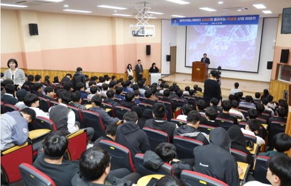 김해 의생명·산업진흥원은 지난 30일 김해 건설공업고등학교와 중소기업비즈니스센터 대회의장에서 김태훈 과학커뮤니케이터를 초청하여 특성화고 학생들에게 의생명산업에 대한 이해도를 제고하기 위한 ’의생명 명사 특강‘을 개최했다.