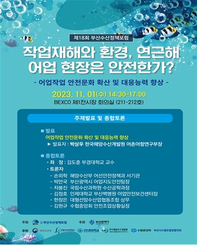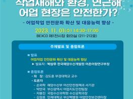 전문가 종합토론에서는 김도훈 부경대학교 교수를 좌장으로 손외학 해양수산부 어선안전정책과 서기관, 박만국 부산시 수산정책과 어업지도안전팀장, 차봉진 국립수산과학원 수산공학과장, 김정호 인제대학교 부산백병원 어업안전보건센터장, 한창은 대형선망수산업협동조합 상무, 김현규 수협중앙회 안전조업상황실장이 토론자로 참여해 열띤 논의를 펼칠 예정이다.