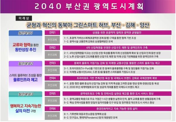 '2040 부산권 광역도시계획'의 미래상은 '균형과 혁신의 동북아 그린스마트 허브, 부산?김해?양산'으로, 계획(안)에는 이를 실현하기 위한 3대 발전목표와 6개의 추진 전략, 12대 추진과제가 담겼다.