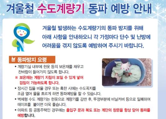 주요 점검 내용으로는 전년도 동파 수도시설 중점 점검과 동파예방에 대한 홍보, 노후된 계량기 점검 및 사전교체 권고, 취수원 결빙 우려가 있는 소규모수도시설 점검과 정비 검토 등이다.