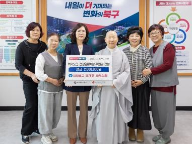 부산 북구는 11월 1일 화명선원에서 구청을 방문하여 ‘독거노인 사랑의 건강음료 배달사업’에 사용해 달라며 후원금 200만원을 전달했다고 밝혔다.