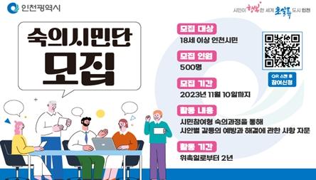 숙의시민단 모집 대상은 18세 이상 인천시민이며, 모집 기간은 2023년 11월 10일까지이다. 신청자 중 성별, 연령별, 지역별 인구비례에 맞게 500명을 선발해 위촉할 계획이며, 위촉일로부터 2년 동안 시민참여형 숙의과정을 통해 갈등의 사안별 예방과 해결에 관한 사항을 자문하는 활동을 하게 된다.
