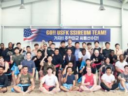 문화재청 공모사업인'국가 무형유산 전승공동체 활성화 지원사업-씨름'을 통해 우리의 전통 민속경기이자 국가 무형유산인 씨름을 배우고 있는 캠프 캐롤 부대 주한미군 장병들이 3일 구미시청 씨름단 연습장 찾아 선수들과 함께 합동 훈련을 했다.