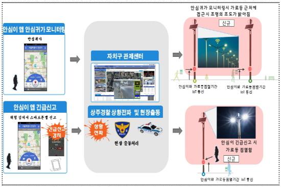 안심이(앱) 실행 후 ‘귀가 모니터링 서비스’를 이용하여 목적지를 설정하면 안심이앱 이용자의 위치 정보가 실시간으로 강북구 통합관제센터에 전송이 되고, 스마트(IoT) 보안등이 설치된 지역은 스마트 보안등이 안심이(앱) 이용자의 위치를 실시간으로 파악하여 미리 자동으로 보안등의 밝기가 밝아져 목적지까지 더 밝은 거리가 조성이 된다.