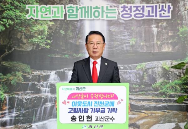 송인헌 괴산군수는 지난 6일 이웃도시인 진천군에 고향사랑기부금 100만 원을 전달했다.