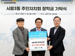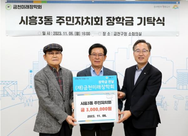 금천구는 11월 6일 시흥3동 주민자치회에서 (재)금천미래장학회에 장학금 300만 원을 기탁했다고 밝혔다.