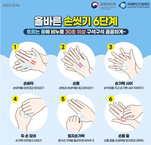 특히 감염병 예방의 가장 기본이 되는 올바른 손씻기 실천으로 설사질환의 30%, 호흡기질환의 20% 등 감염병 발생을 예방할 수 있으며, 식사 전후, 화장실 이용 후, 코를 풀거 나 재채기를 한 후에 흐르는 물에 비누를 사용해 30초 이상 깨끗이 손을 씻어야 한다.