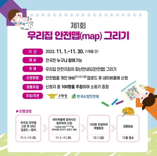 참여방법은 안전맵을 그리고 개인 SNS(인스타그램)에 업로드 후 캡쳐 사진과 함께 네이버폼을 통해 신청하면 된다. 전 국민 누구나 참여가능하며, 신청자 중 100명을 추첨해 소화기를 증정할 예정이다.