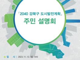 서울 강북구는 오는 13일 오후 2시 구청 4층 대강당에서 ‘2040 강북구 도시발전계획’ 주민설명회를 개최하고, 약 20년간 구의 도시발전을 이끌 목표들을 제시한다.