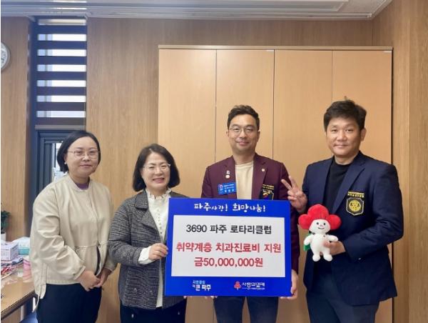 파주시는 7일 국제로타리 3690지구 파주 로타리클럽과 협약해 관내 저소득 취약계층에 치과진료비 5,000만 원을 지원했다.